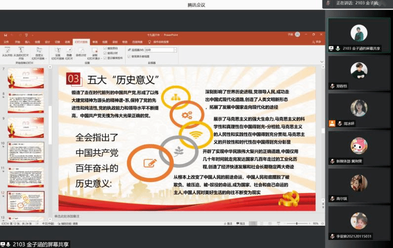2021年11月21日上午,beat365官方网站团总支学生会召开线上会议,学习党的十九届六中全会精神。beat365官方网站团总支学生会干部及各班团支书参加学习。活动由beat365官方网站团总支副书记周冰妍主持,21级3班团支书金子涵作学习分享报告。