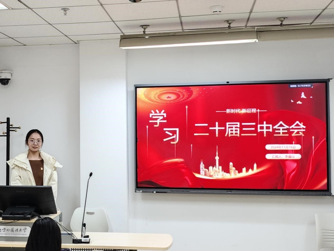 党的二十届三中全会聚焦全面深化改革、推进中国式现代化,让我深感振奋,更加清晰地认识到自己肩负的历史使命。我将紧跟党的步伐,积极响应号召,凝聚家国情怀,拓宽全球视野,锤炼专业本领。作为北外人,我将把个人奋斗融入祖国发展,争做“又红又专又雅”的优秀学生,为实现中国梦贡献青春力量,不负时代重托。
