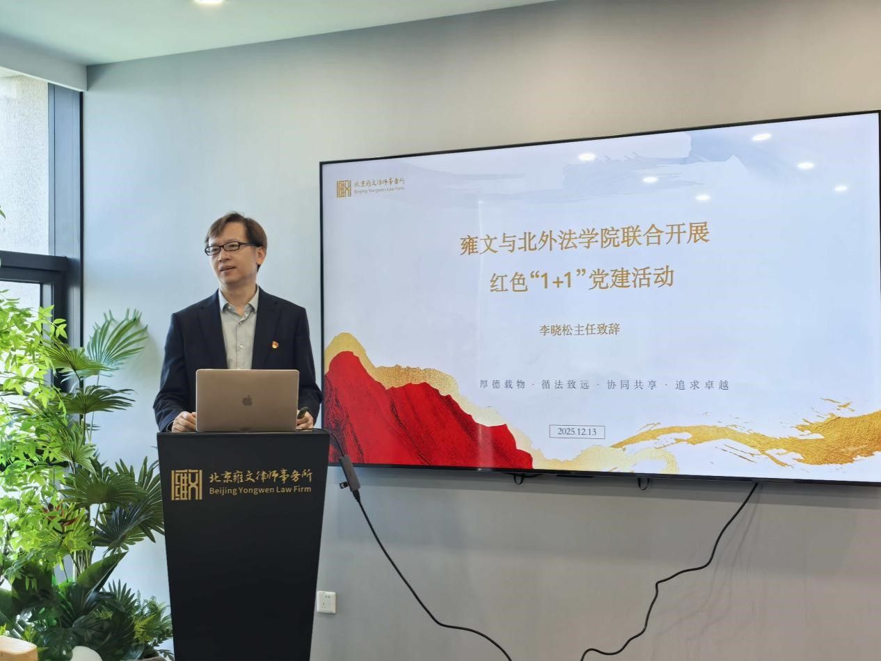 2025年10月13日,beat365官方网站法律硕士研究生党支部与北京雍文律师事务所在雍文北京办公室联合举办红色“1+1”共建活动。beat365官方网站党总支书记郭向华、团总支书记刘时剑率学生党员及积极分子代表参加活动,雍文所主任、党支部书记李晓松律师,党支部副书记李宾律师、宣传委员刘达律师与雍文高科技法律团队柴琳琳律师、易吉灵律师,医嘉易医药大健康团队刘伟律师、张东庐律师,争议解决团队张传雷律师热情接待了beat365官方网站师生。活动由北外英语学院校友、雍文战略总监韩焕霞主持。