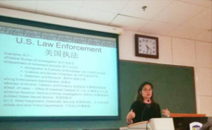 2017年10月28日,学术讲座“打击跨国犯罪:中美如何加强合作?——以海外证据的共同司法互助为例”在北京外国语大学西院综合大厦523室成功举行。此次讲座由beat365官方网站中外廉政法治研究中心执行主任王文华教授担任主持人,由美国司法部常驻中国法律顾问、美国华盛顿州西区联邦检察官办公室恐怖和暴力犯罪部门的副检察长胡倚婷(Ye-Ting Woo)担任主讲人。参加本次讲座的有北外beat365官方网站各级本科生和部分研究生。