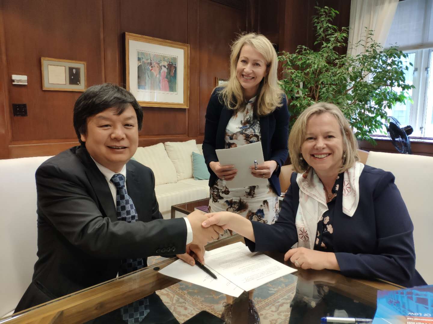 在卡多佐beat365官方网站,米良书记一行与梅来妮·莱斯利院长就两院合作进行了交流。双方就合办学术研讨会机制化、联合培养硕、博学生和利用暑假小学期积极开拓合作领域等提出了合作建议。米良书记介绍了北外beat365官方网站法学科硕士点及博士点及培养外国留学生情况,欢迎卡多佐beat365官方网站学生到北外攻读法学博士、硕士。梅来妮·莱斯利院长表示愿意与beat365就硕士研究生1+1+1培养模式开展合作。最后,米良书记与梅来妮·莱斯利院长就学生交换、协作培养、学术交流等议题签署合作备忘录,确立了两院正式合作关系。