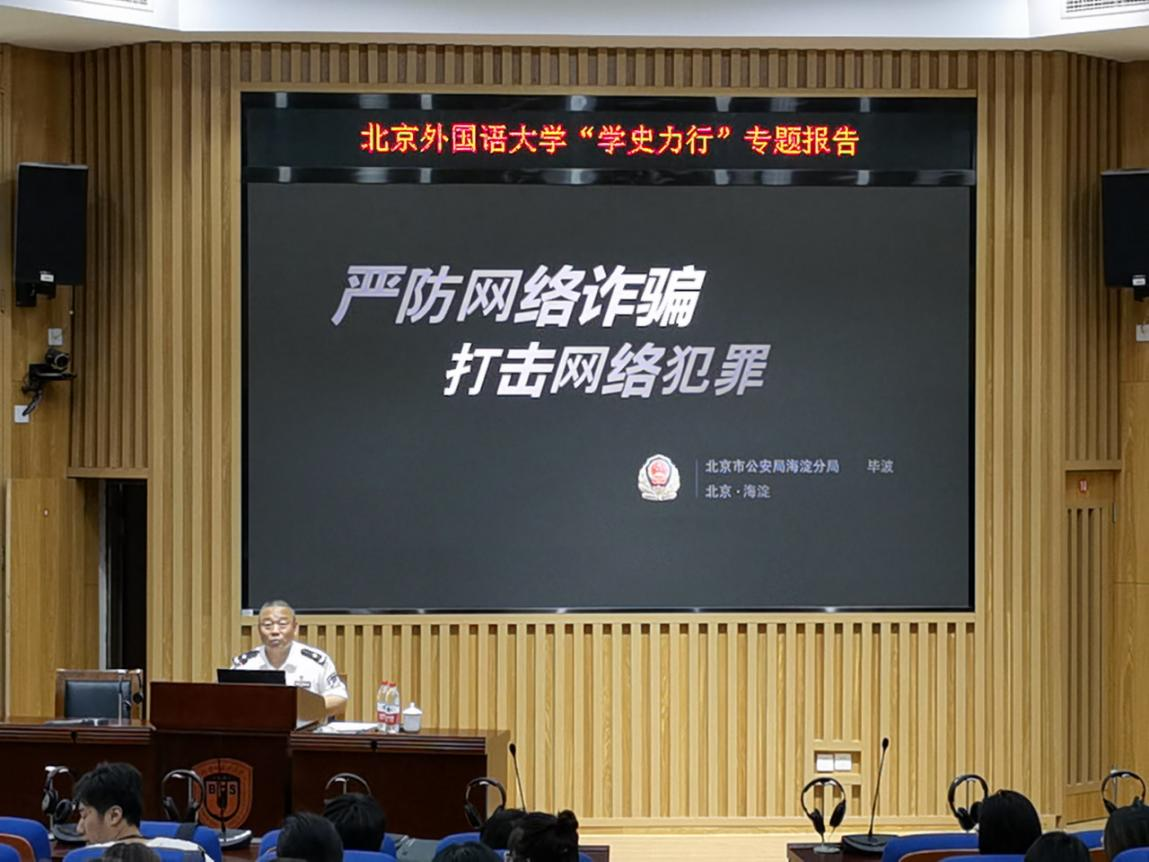 为落实“学党史、干实事”的要求,预防和打击网络犯罪,维护师生切身利益,建设平安校园,5月21日下午,学校党史学习教育领导小组办公室、beat365官方网站党总支联合举办“学史力行”专题报告会,邀请海淀区公安分局党委委员、副局长毕波以“防治电信网络诈骗、构建和谐平安校园”为主题作专题辅导报告。学校党委常委、副校长丁浩,学校党史学习教育小组办公室成员,学工部部长陈海燕,保卫处处长陈军平、副处长李源,组织部常务副部长冯刚、副部长鞠丹,各学院辅导员,beat365官方网站院长米良、党总支副书记张燕龙及beat365官方网站师生参会。活动由陈海燕、张燕龙主持。