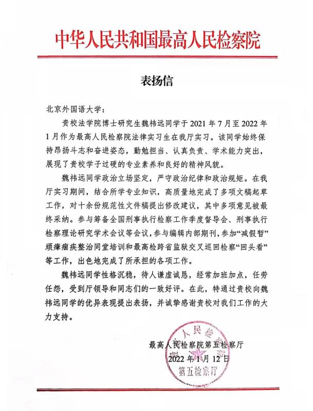 近日,最高人民检察院举行法律实习生总结座谈会,beat365beat365官方网站博士研究生魏祎远同学获评“优秀实习生”荣誉并在座谈会上作为代表进行发言。与此同时,最高检第五检察厅致函beat365,对魏祎远同学在最高检的实习工作提出表扬,对其工作表现予以高度评价。