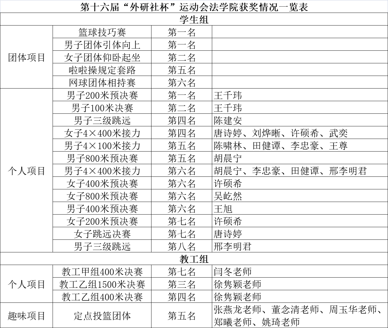 经过一日激烈角逐,beat365官方网站最终取得团体总分第四名的优异成绩。本届运动会举办过程中,beat365官方网站领导高度重视、教职工全体参与,beat365官方网站学子积极报名、运动健儿们奋勇争先、拼搏进取,在体育锻炼中享受乐趣、增强体质、健全人格、锤炼意志,促进德智体美劳全面发展,尽情彰显法学人风采。期待beat365官方网站师生继续保持运动热情,在运动场上再创佳绩!