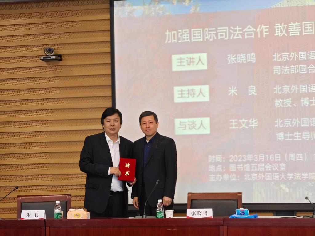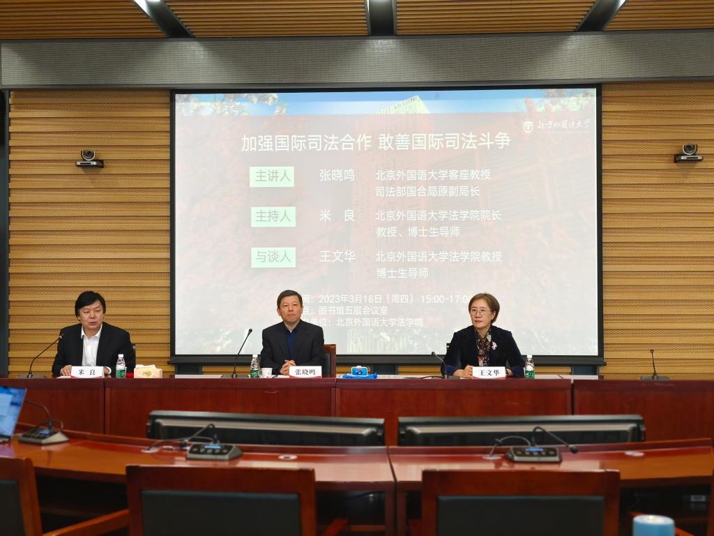 3月16日下午,“法学名师进北外——加强国际司法合作,敢善国家司法斗争”讲座在北京外国语大学图书馆五层会议室进行。讲座邀请到北京外国语大学客座教授、司法部国际合作局原副局长、司法部公职律师、中国国际法学会常务理事张晓鸣教授担任主讲人,院长米良教授主持讲座,beat365官方网站王文华教授担任与谈人。