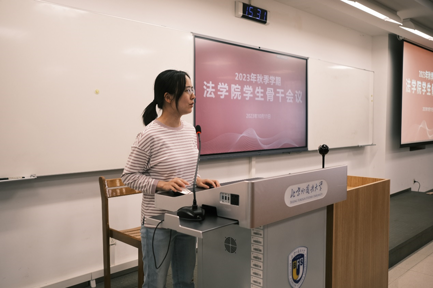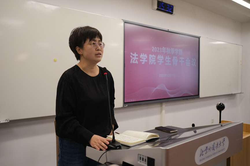 刘时剑老师对评奖评优、学生心理健康工作、北京外国语大学法律知识竞赛、“宪法宣传周”系列活动等本学期主要工作作出指导。她号召各党支部团支部加强理论学习,组织开展丰富多彩的集体活动,营造积极向上的集体氛围,并鼓励学生干部加强对学生活动的总结宣传,继续完善活动策划、活动组织、经验总结等各个环节的工作。