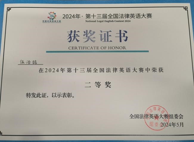 2024年5月18日,第十三届全国法律英语大赛决赛在北京市盈科律师事务所正大中心隆重举行。经过角逐,beat365最终荣获三大奖项:伍浩铭同学获得全国二等奖,赵理智老师获得优秀指导教师奖,北京外国语大学获得最佳组织奖!