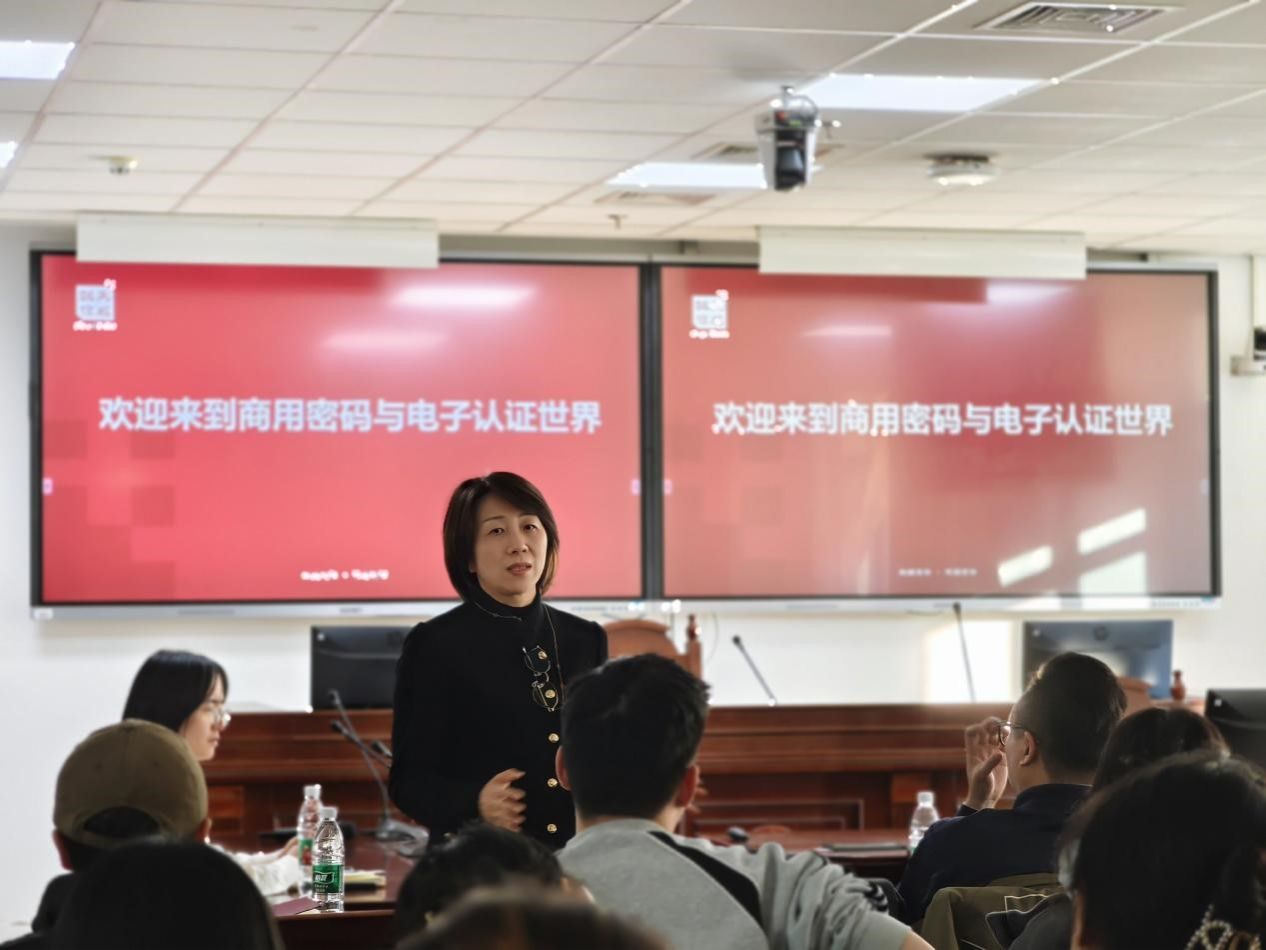 陈韶光董事长以其深厚的法律专业功底和丰富的电子认证行业从业经历,为同学们做了分享,生动阐述了电子认证技术与法学学科的紧密联系。她指出,在数字化时代,电子认证技术已成为保障信息安全、推动法律变革的重要力量。