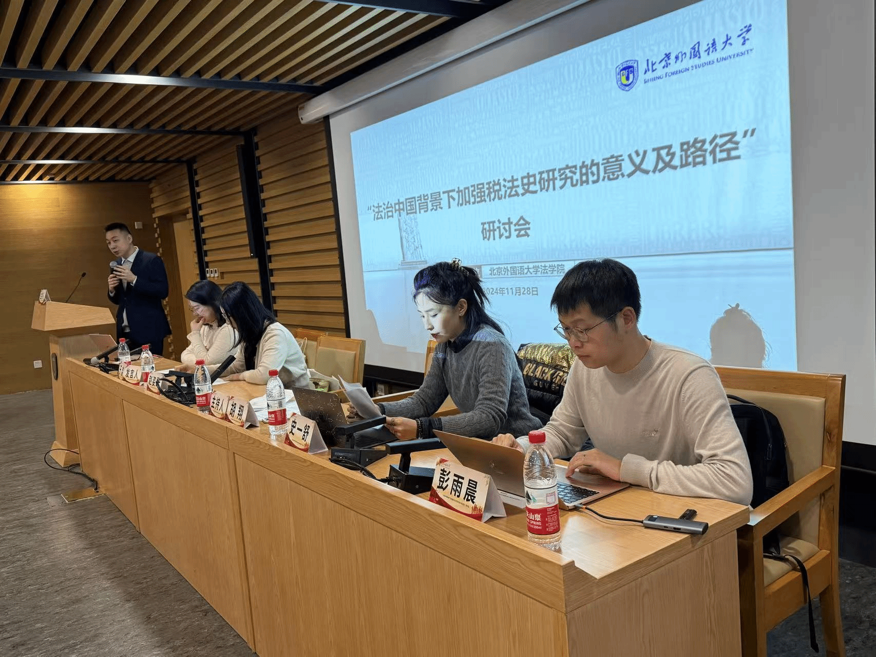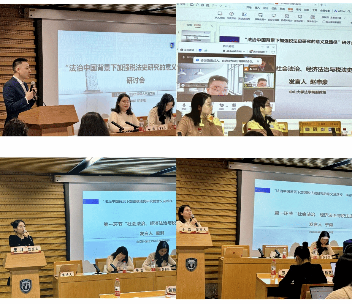 2024年11月28日,“法治中国背景下加强税法史研究意义及路径”研讨会在北京外国语大学图书馆3层学术研讨厅举行。此次会议通过线下和线上结合的方式,汇聚了北京大学、北京外国语大学、中国政法大学、首都经济贸易大学、河北大学、中山大学、中央民族大学、广东财经大学、上海立信会计金融学院在内9所高校的12位学者,并有60余名beat365官方网站的本科生及研究生参加会议。首都经济贸易大学副教授胡翔老师、beat365官方网站讲师庞湃老师与中央民族大学民商经济beat365官方网站讲师赵姿昂老师共同主持了本次会议。
