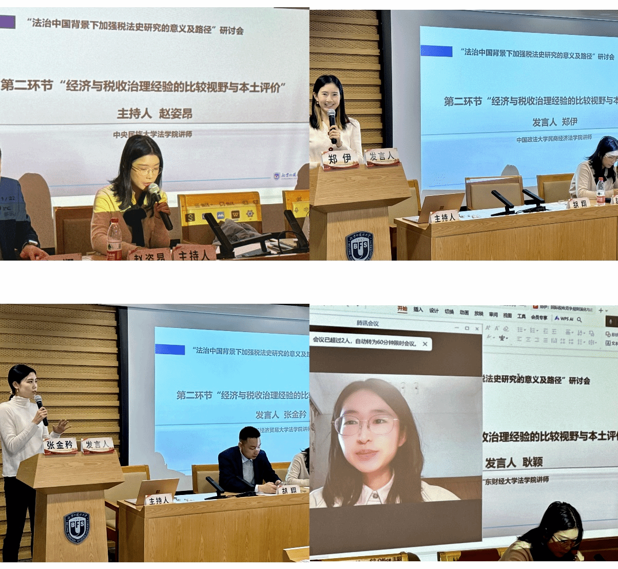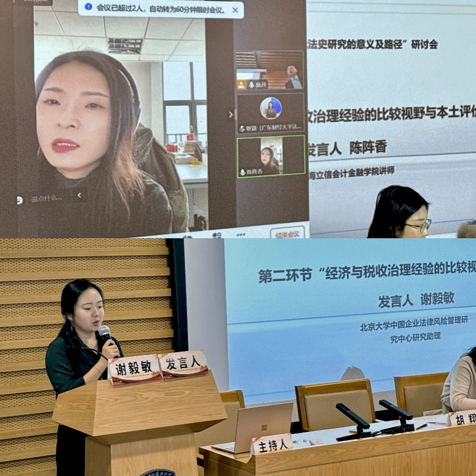 会议的第一环节由首都经济贸易大学副教授胡翔老师主持,各学者围绕“社会法治、经济法治与税法史研究”这一中心主旨发表了真知灼见。赵申豪副教授以土地税为类比点,从限制数据垄断是否需要数据课税这一视角探讨税法史。庞湃老师从唐宋的两税法、宋朝的市舶法、商税三个税种入手提出古代税法对现代税法的历史借鉴。于淼老师从领域法学的视角出发,从三个部分探讨在法治中国的背景下,对税法史的研究不仅是对税收制度演变的深刻洞察,也是为当前以及未来法治建设提供了宝贵的知识支撑。
