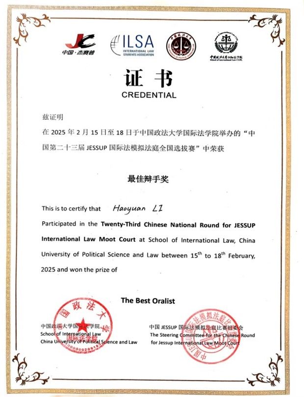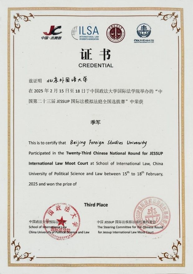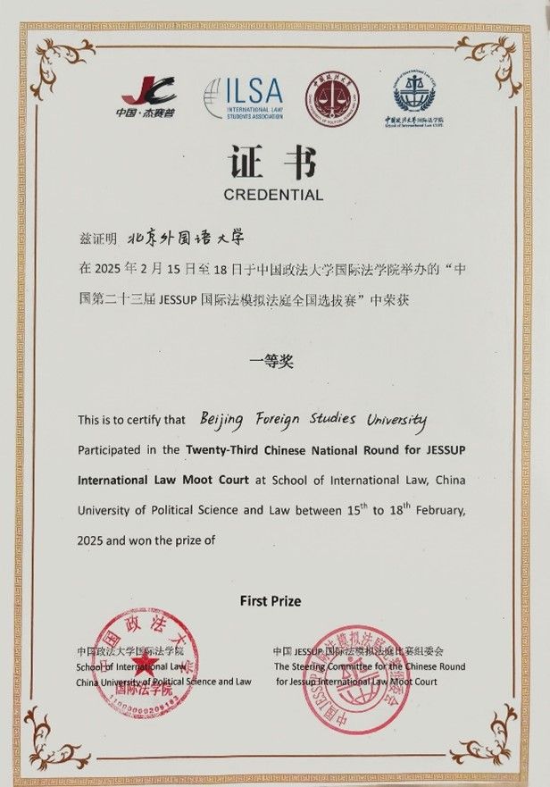 2025年2月15日至18日,第二十三届“杰赛普”(JESSUP)国际法模拟法庭全国选拔赛于中国政法大学海淀校区举行。经过了三天的激烈角逐,北京外国语大学代表队从全国66所参赛院校中脱颖而出,连续在四场循环赛和两场淘汰赛中获胜,最终荣获全国季军、全国一等奖,追平了北外征战该项赛事的历史最佳战绩,时隔十年再次获得代表中国出征“杰赛普”国际赛的资格。其中,赛队队员翟石玉(全部参赛辩手中位列第一)与李浩源荣获最佳辩手(Best Oralist)称号。