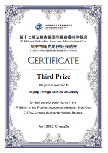 多年来,北外beat365官方网站依托北京外国语大学国内一流的外语资源,专注培养具有坚定政治立场、卓越专业素质、通晓国际规则、精通涉外法律实务的涉外法治人才。北外beat365官方网站高度重视法兰克福国际投资模拟仲裁庭赛事,积极组织学生参与赛事选拔与备赛,通过专业导师指导等方式,提升学生国际投资仲裁实务能力,助力学生在国际舞台展现中国法律学子风采,为培养兼具国际视野与专业素养的涉外法律人才搭建实践平台。