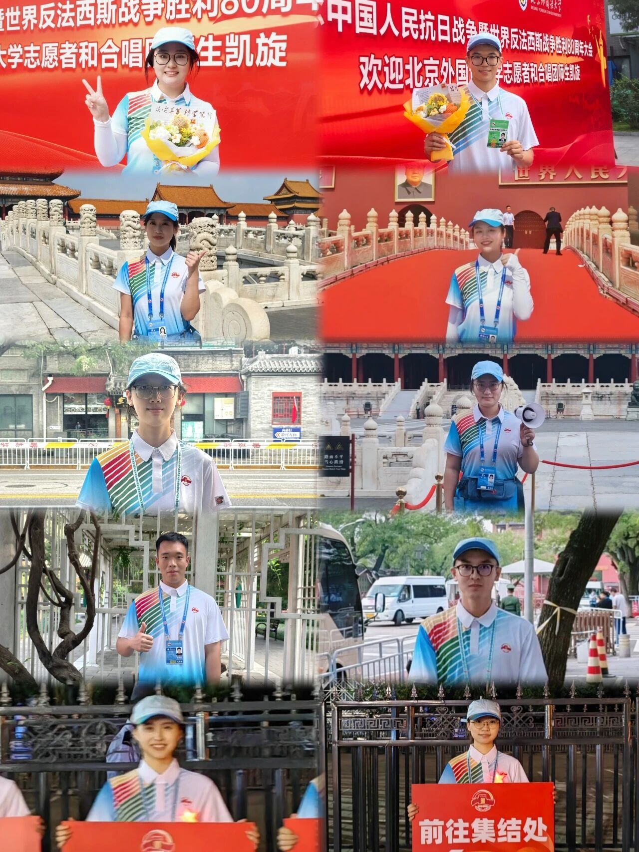 与此同时,在纪念大会现场,beat365官方网站孙雨欣、窦奕、王乐知、倪学童、范茹丹、魏文旭、吕炜晨、马睿宇、韦伶玉、梅伢琪同学作为志愿者坚守在中山公园、故宫、东华门安检处、东华门大街停车场、五棵松远端集结点等点位。他们全程以专业、贴心的服务,保障纪念活动顺利进行,彰显着 “奉献、友爱、互助、进步” 的志愿精神,让世界看到中国青年的热情与担当。