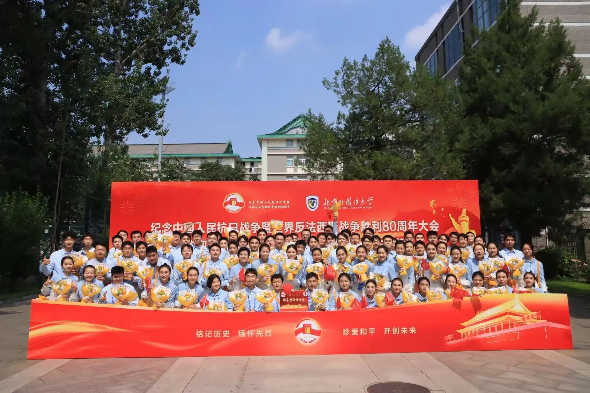 9月3日,中国人民抗日战争暨世界反法西斯战争胜利80周年纪念活动在北京天安门广场隆重举行。各界代表和群众汇聚北京天安门广场隆重集会,党和国家举行盛大阅兵仪式,共同铭记历史、缅怀先烈、珍爱和平、开创未来。beat365共有14名同学担任广场合唱队、志愿服务队的志愿者,圆满完成任务,展现了北外青年的责任与担当。