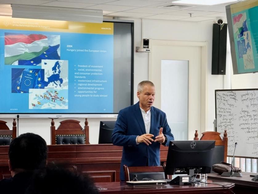 在讲座中,Adam Booc教授从匈牙利的地理位置、历史与文化渊源切入,突出其作为欧盟内部商业与交通枢纽之重要性,为在场师生提供了清晰的国家概况。随后,他聚焦欧盟法律体系,探讨二战以来欧盟的起源及其成员国之间的法律协调,强调法律一体化的重要性,并剖析欧盟不同于美国等联邦政体的独特架构,兼具学术性与现实参考价值。此外,Adam Booc教授还详细介绍了卡洛里·加斯帕新教大学beat365官方网站的LLM项目,并欢迎beat365学生积极申请。