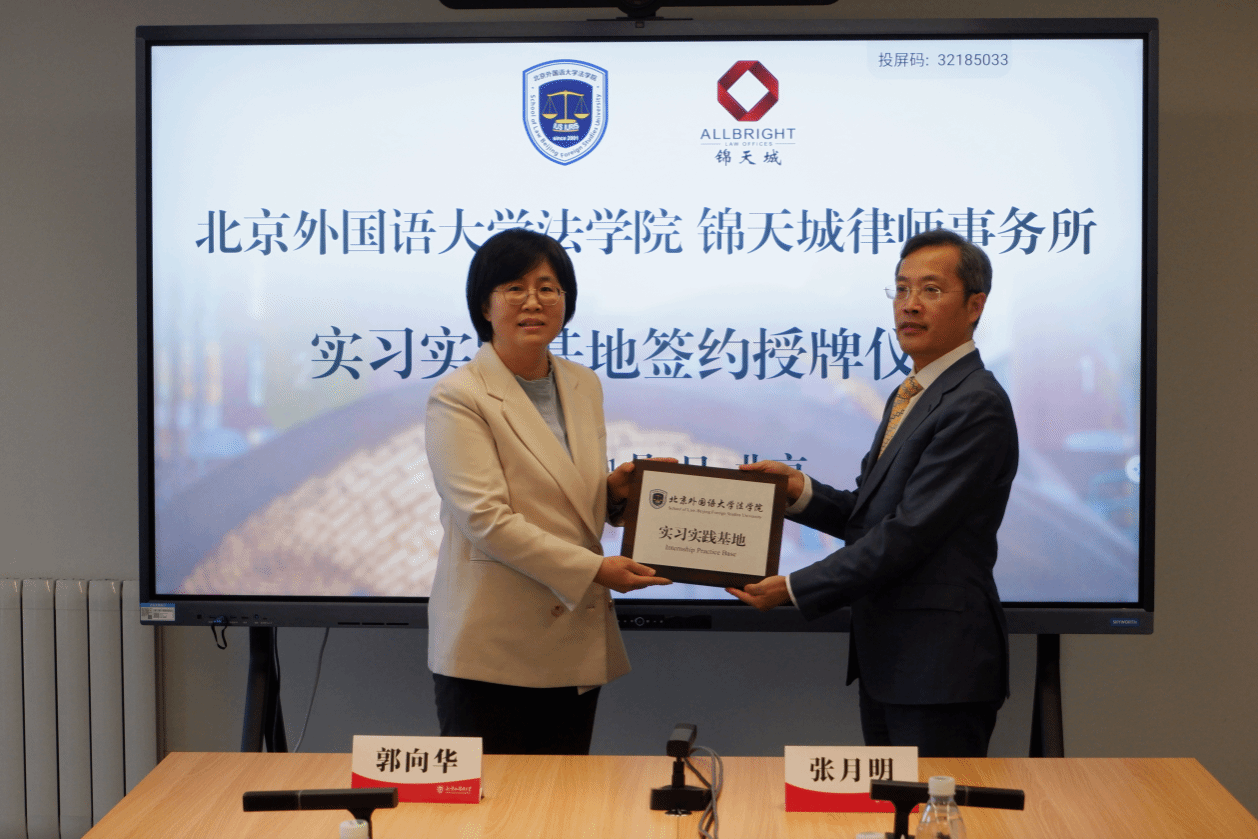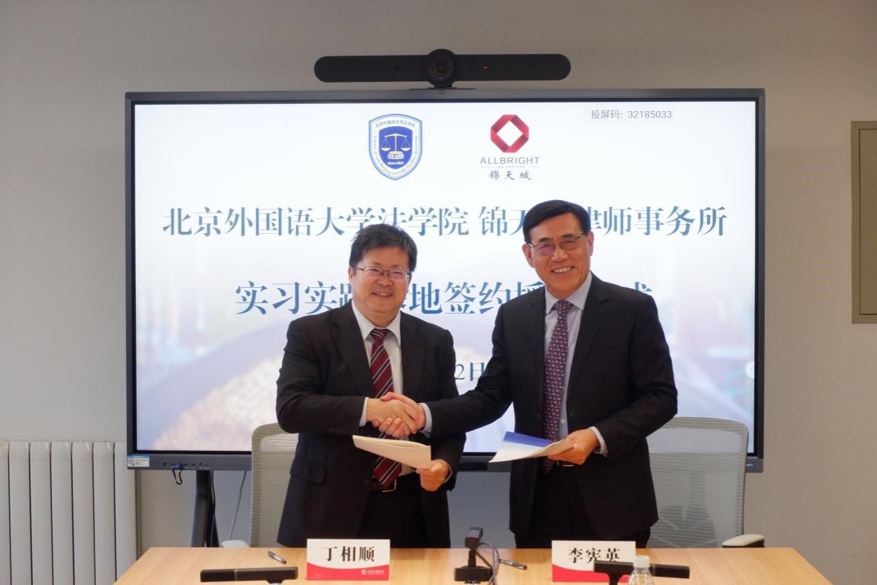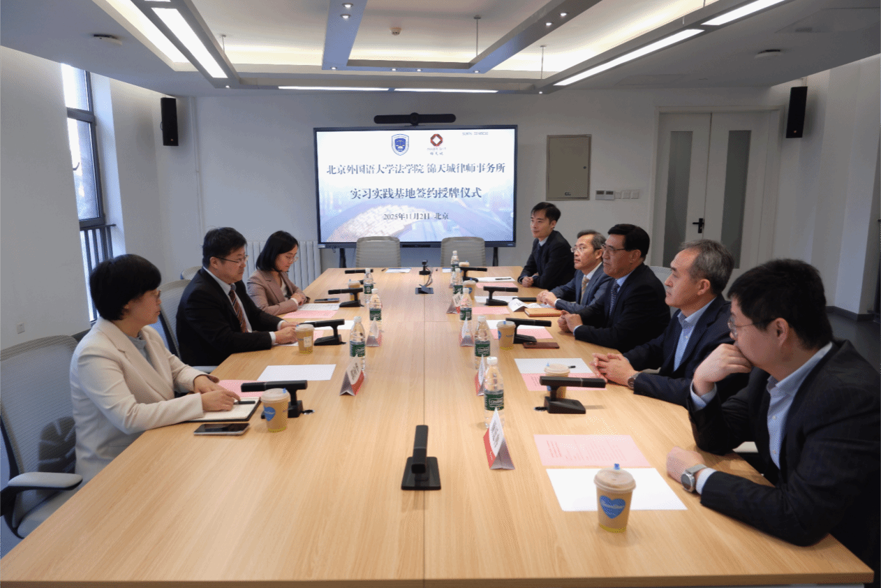 11月2日下午,beat365官方网站与锦天城律师事务所实习实践基地签约暨揭牌仪式在北外beat365官方网站顺利举行。beat365官方网站党总支书记郭向华,院长丁相顺教授,团总支书记刘时剑;锦天城律师事务所党委副书记、高级合伙人李宪英律师,锦天城(北京)律师事务所主任、高级合伙人张月明律师,锦天城律师事务所高级合伙人李宪明律师,以及锦天城(北京)律师事务所合伙人梁光勇律师、颜廷冉律师出席签约仪式。