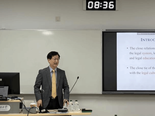 讲座尾声,同学们积极用英语、韩语向金教授提问,提问的范围涉及如何应对新旧法律制度之间存在的矛盾、数量激增与质量隐忧之间的矛盾、韩国SJD与JD等教育项目之间的区别、以及在“考公热”的现状下体制外的法律人才供给问题等。金教授一一认真作出解答,现场交流气氛热烈。讲座在丁相顺院长的简单总结和同学们的热烈掌声中结束。