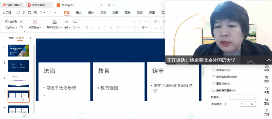 北京外国语大学教师发展中心主任、援新疆师范高等专科学校(新疆教育学院)发展规划处处长姚金菊线上参会,结合第十一批援疆专家团队服务基层活动,强调以法治教育助力铸牢中华民族共同体意识主线工作,去年全国青少年法治教育中心和普法网捐赠和田地区法治教室,锦天城(乌鲁木齐)律师事务所王宏吉团队、北京中企华资产评估有限责任公司、新疆禾利方则拍卖有限公司本次捐助和田地区中小学法治教师来京研修,北京新疆多方共同助力中小学教师队伍建设。