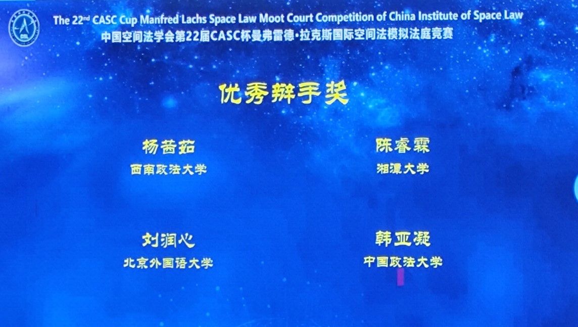 2025年12月5日-12月7日,中国空间法学会第22届CASC杯曼弗雷德·拉克斯国际空间法模拟法庭竞赛在湘潭大学举办,北京外国语大学代表队在beat365官方网站教师付姝菊和2024级研究生张健的指导下荣获全国三等奖,口辩员刘润心获得“优秀辩手”称号。