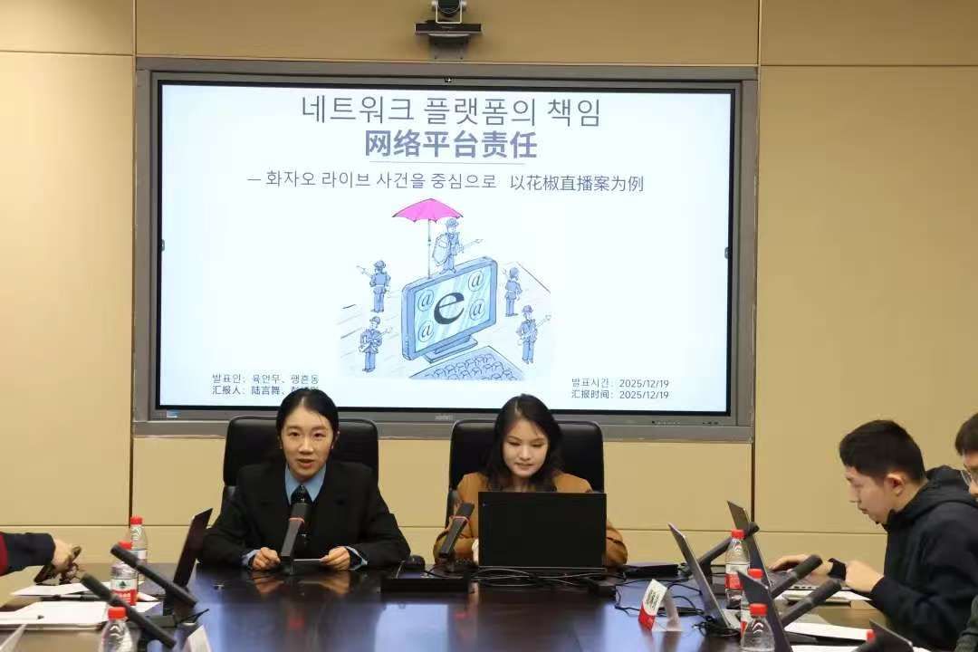 在学生座谈环节,双方学生代表分别以“韩国法下网络平台的非法信息禁令”、“网络平台责任”、“文本与数据挖掘(TDM)例外条款立法方向的比较研究”、“中国数字资产继承的法律框架、实践与困境”、“数字资产继承的立法考量——海外案例与国内尝试”为主题,结合具体案例分享研究成果,展现了青年学子的学术视野与思辨能力,为两国法律制度交流注入了青春活力。