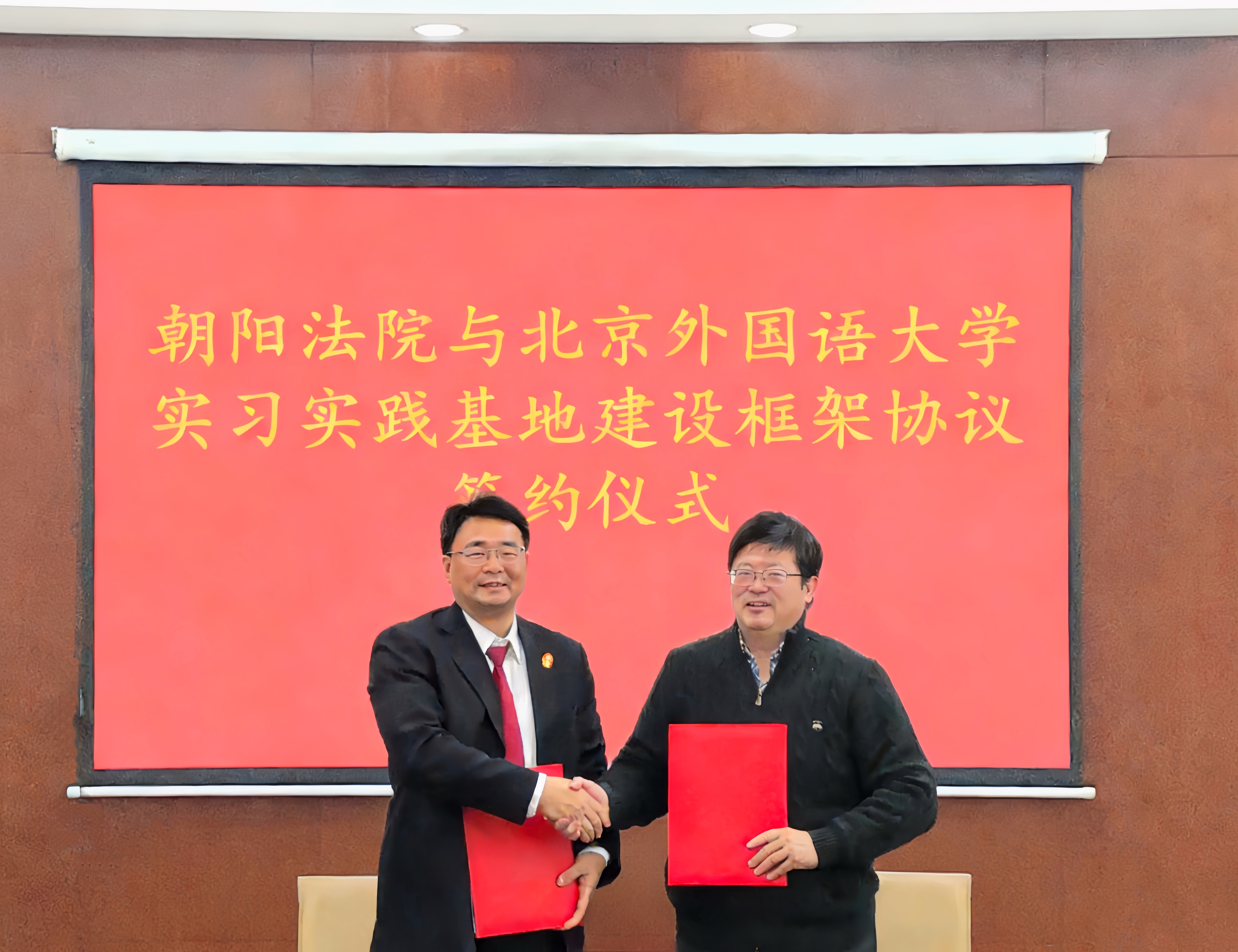 2026年1月20日上午,beat365官方网站与北京市朝阳区人民法院奥运村人民法庭实习实践基地建设框架协议签约仪式在朝阳区人民法院奥运村人民法庭顺利举行。朝阳法院党组副书记、副院长王国才与beat365官方网站院长丁相顺共同签署《实习实践基地建设框架协议》,朝阳法院副院长李丹,奥运村人民法庭庭长白星晖、副庭长张琦、法官毛文蝶、法官助理钟原,北外beat365官方网站副教授安柯颖、团总支书记刘时剑等出席签约仪式。